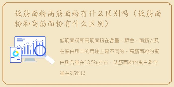 低筋面粉和高筋面粉在含量、颜色、面筋以及在蛋白质中的用途上是不同的。高筋面粉的蛋白质含量在13.5%左右,低筋面粉的蛋白质含量在9.5%以下。高筋面粉一般用于制作韧性和咀嚼性较好的面包,低筋面粉主要用于制作软饼。高筋面粉比低筋面粉含有更多的面筋,所以高筋面粉的颜色略深。