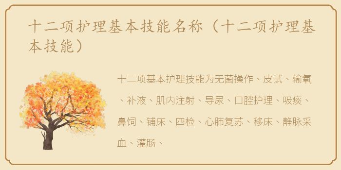 十二项基本护理技能为无菌操作、皮试、输氧、补液、肌内注射、导尿、口腔护理、吸痰、鼻饲、铺床、四检、心肺复苏、移床、静脉采血、灌肠、脱隔离衣。急救技能:心肺脑复苏、人工心肺复苏、呼吸机、心电图机、洗胃机、除颤器的使用、气管切开术、气管插管等。