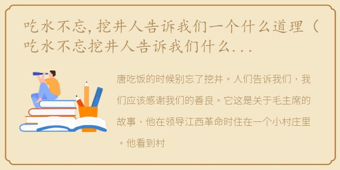 唐吃饭的时候别忘了挖井。人们告诉我们,我们应该感谢我们的善良。它这是关于毛主席的故事,他在领导江西革命时住在一个小村庄里。他看到村里的村民都在喝泥水,就决定带领村民挖一口井,亲自带头挖。终于挖到了第一口井,村民们吃上了甘甜的井水。解放后,当地人在井边立了一块碑,上面刻着这样的话:我不饮水不忘挖井人,我永远怀念毛主席。"