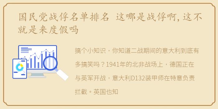 搞个小知识,你知道二战期间的意大利到底有多搞笑吗?1941年的北非战场上,德国正在与英军开战,意大利D132装甲师在特意负责拦截。英国也知道意大利军队的豆腐渣民生,很多将军都争着抢着,要和意大利打夺不起人,意大利并未放一枪一炮就投降了。