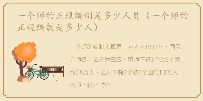 一个师的编制大概是一万人。1931年,国民党师级单位分为三级:甲师下辖3个旅9个团约1.8万人,乙师下辖3个旅6个团约1.2万人,丙师下辖2个旅5个团约1万人。建国后中国人民解放军(PLA)进行了重组,一个师加上附属部队的人数约为8000人。