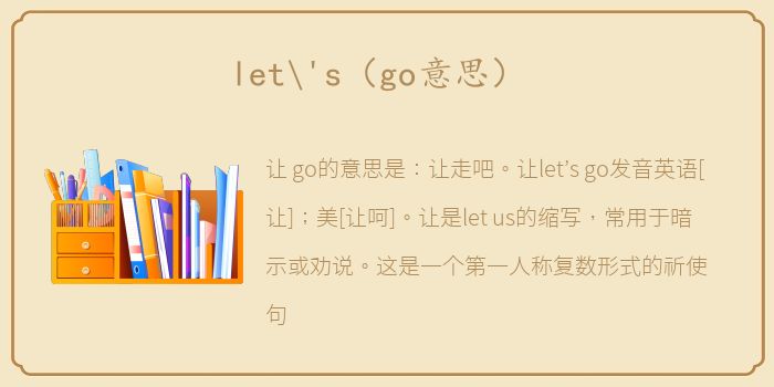 让 go的意思是:让走吧。让let’s go发音英语[让];美[让呵]。让是let us的缩写,常用于暗示或劝说。这是一个第一人称复数形式的祈使句。
