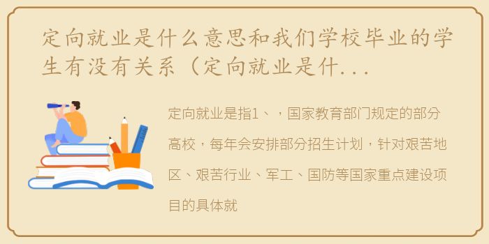 定向就业是指1、,国家教育部门规定的部分高校,每年会安排部分招生计划,针对艰苦地区、艰苦行业、军工、国防等国家重点建设项目的具体就业方向,称为定向就业;2、是教育培训机构,企业或者成人院校等。它招收学生。首先,他们提前签订一个就业单位,然后他们接受专业培训。以后学生毕业后直接进入签约单位,称为定向就业。