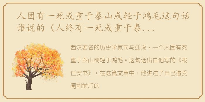 西汉著名的历史学家司马迁说,一个人固有死重于泰山或轻于鸿毛。这句话出自他写的《报任安书》。在这篇文章中,他讲述了自己遭受阉割前后的内心痛苦,提出了个人的生死观,展示了自己为了实现有价值的理想而忍辱负重、坚忍不拔的精神。