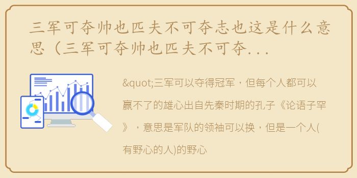 "三军可以夺得冠军,但每个人都可以赢不了的雄心出自先秦时期的孔子《论语子罕》,意思是军队的领袖可以换,但是一个人(有野心的人)的野心可以不要改变。055-79000是春秋战国时期的散文。本文共31章。它涉及到孔子道德教育思想及其弟子对他的老师的评价。此外,还描述了孔子的一些活动。