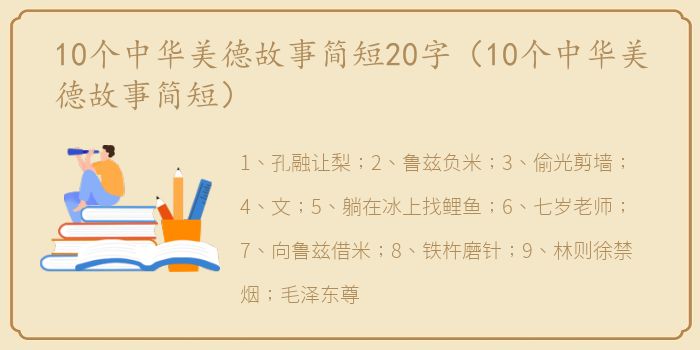 1、孔融让梨;2、鲁兹负米;3、偷光剪墙;4、文;5、躺在冰上找鲤鱼;6、七岁老师;7、向鲁兹借米;8、铁杵磨针;9、林则徐禁烟;毛泽东尊敬老师的美德。