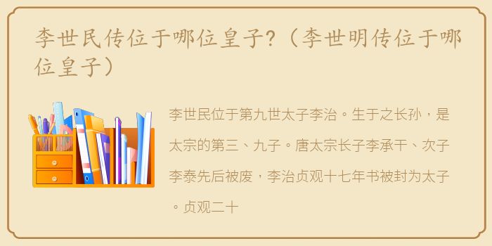 李世民位于第九世太子李治。生于之长孙,是太宗的第三、九子。唐太宗长子李承干、次子李泰先后被废,李治贞观十七年书被封为太子。贞观二十三年,太子李治为唐高宗即位。唐高宗(628-683),别号雉奴,是唐朝第三任皇帝李世民的第九子。总共在位34年。