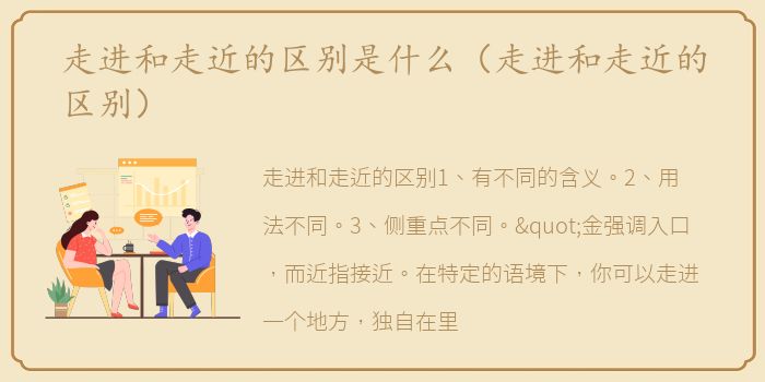 走进和走近的区别1、有不同的含义。2、用法不同。3、侧重点不同。"金强调入口,而近指接近。在特定的语境下,你可以走进一个地方,独自在里面。然而,接近可以是一个地方或一个抽象的东西,强调一的身体很接近,但一自己的可以缺席。