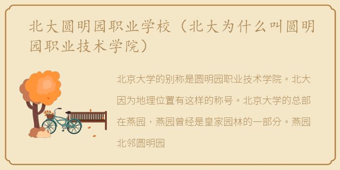 北京大学的别称是圆明园职业技术学院。北大因为地理位置有这样的称号。北京大学的总部在燕园,燕园曾经是皇家园林的一部分。燕园北邻圆明园,西邻西河园。