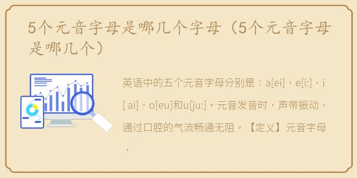 英语中的五个元音字母分别是:a[ei],e[i:],i[ ai],o[eu]和u[ju:]。元音发音时,声带振动,通过口腔的气流畅通无阻。【定义】元音字母,或元音字母,是一种语言中起发音作用的字母。元音也叫元音,就是这个意思。