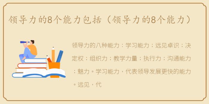 领导力的八种能力:学习能力;远见卓识;决定权;组织力;教学力量;执行力;沟通能力;魅力。学习能力,代表领导发展更快的能力。远见,代表着领导者的远见,决定着领导者能否做正确的事。决策权,代表领导者的思维能力和决策能力。组织,代表领导优化资源配置和实现成果转化的能力。教学,代表领导领导团队教育人民的能力。