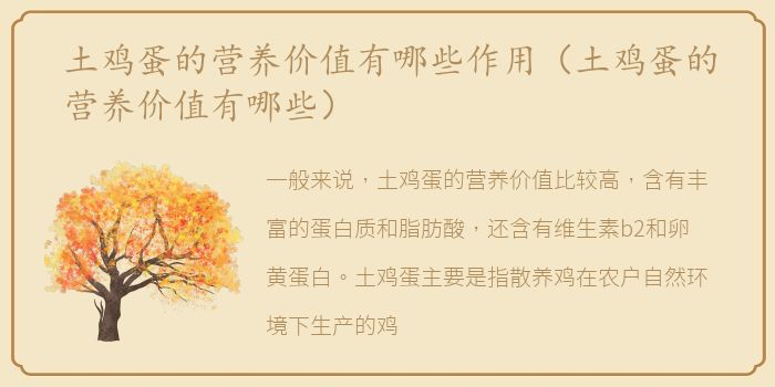 一般来说,土鸡蛋的营养价值比较高,含有丰富的蛋白质和脂肪酸,还含有维生素b2和卵黄蛋白。土鸡蛋主要是指散养鸡在农户自然环境下生产的鸡蛋。