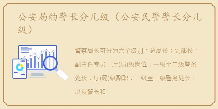警察局长可分为六个级别:总局长;副部长:副主任专员;厅(局)级岗位:一级至二级警务处长;厅(局)级副职:二级至三级警务处长;以及警长和警官。