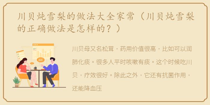 所以大家要学会合理食用川贝,可以把川贝和雪梨放在一起炖汤。一、川贝炖雪梨的方法是雪梨2个,川贝10个。