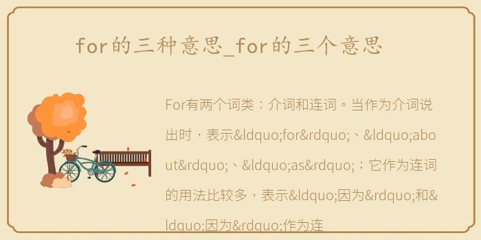 For有两个词类:介词和连词。当作为介词说出时,表示“for”、“about”、“as”;它作为连词的用法比较多,表示“因为”和“因为”作为连词。