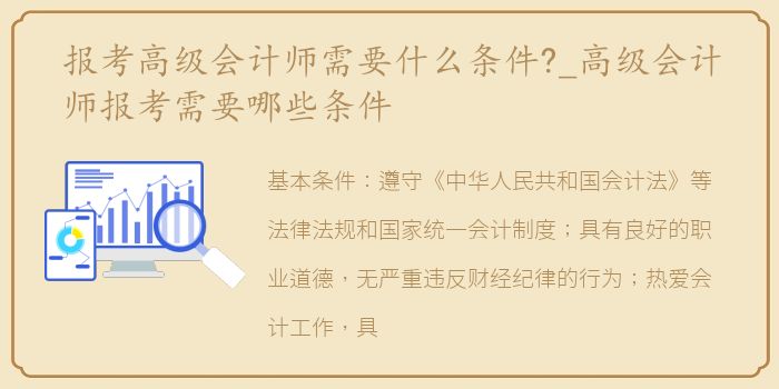 基本条件:遵守《中华人民共和国会计法》等法律法规和国家统一会计制度;具有良好的职业道德,无严重违反财经纪律的行为;热爱会计工作,具备相应的会计专业知识和业务技能。