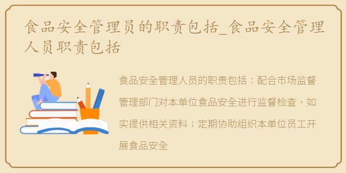 食品安全管理人员的职责包括:配合市场监督管理部门对本单位食品安全进行监督检查,如实提供相关资料;定期协助组织本单位员工开展食品安全法律法规和食品安全知识培训;制定本单位的食品安全管理制度和岗位责任制,并监督检查实施情况;管理食品安全检查。