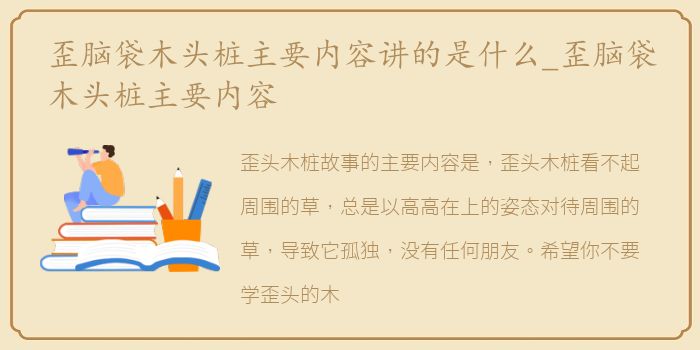 歪头木桩故事的主要内容是,歪头木桩看不起周围的草,总是以高高在上的姿态对待周围的草,导致它孤独,没有任何朋友。希望你不要学歪头的木桩。无论你的长相或者其他条件如何,都不能嘲笑别人。每个人都有自己的优点和缺点。也许他自己的缺点恰恰是别人的优点。