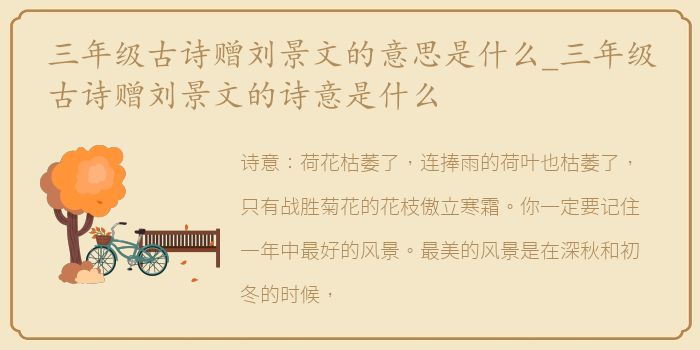 诗意:荷花枯萎了,连捧雨的荷叶也枯萎了,只有战胜菊花的花枝傲立寒霜。你一定要记住一年中最好的风景。 最美的风景是在深秋和初冬的时候,是橙黄色和绿色。《致刘京闻》是北宋文学家苏轼的一首七言绝句。 这是一首鼓励我的好朋友刘京闻的诗。