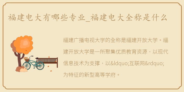 福建广播电视大学的全称是福建开放大学。福建开放大学是一所聚集优质教育资源,以现代信息技术为支撑,以“互联网”为特征的新型高等学府。它为社会成员提供继续教育和非学历教育,为全民终身学习服务。它是国家开放大学办学体系的重要组成部分。学校前身为福建广播电视大学,创建于1979年1月,2020年12月正式更名为福建开放大学。