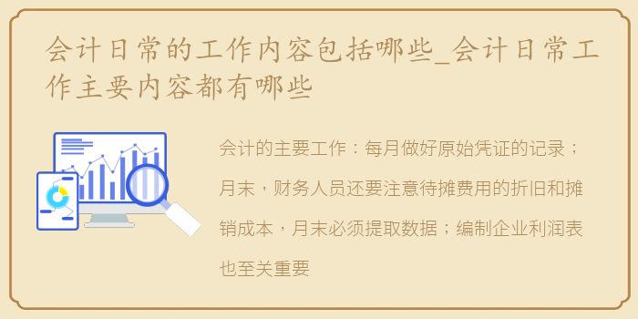 会计的主要工作:每月做好原始凭证的记录;月末,财务人员还要注意待摊费用的折旧和摊销成本,月末必须提取数据;编制企业利润表也至关重要。