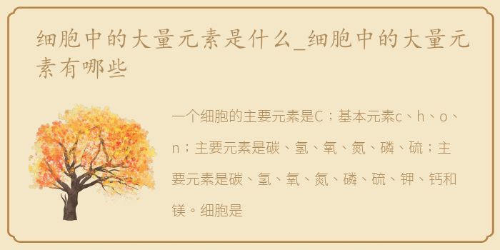一个细胞的主要元素是C;基本元素c、h、o、n;主要元素是碳、氢、氧、氮、磷、硫;主要元素是碳、氢、氧、氮、磷、硫、钾、钙和镁。