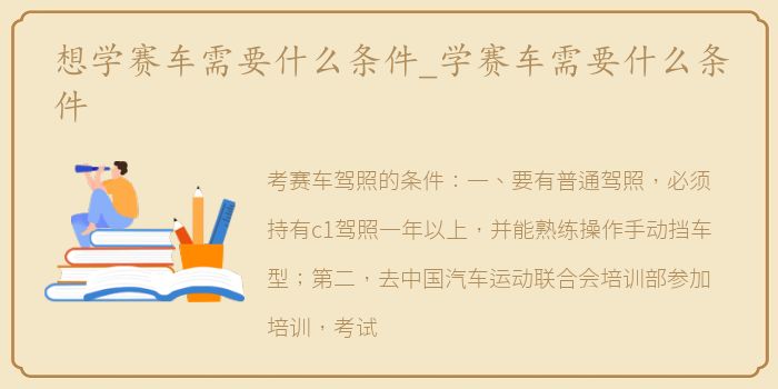 考赛车驾照的条件:一、要有普通驾照,必须持有c1驾照一年以上,并能熟练操作手动挡车型;第二,去中国汽车运动联合会培训部参加培训,考试合格后拿到赛车执照;第三,通过各大赛车俱乐部或省市汽车运动协会的培训考试后,申请FASC获得赛车执照。