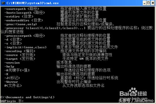 现在测试环境变量的配置成功与否。在DOS命令行窗口输入“JAVAC”,输出帮助信息即为配置正确。如图: