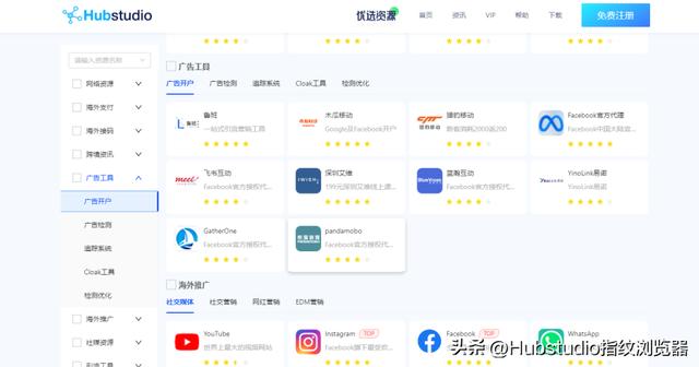 想进一步了解更多主流的开户平台以及其它推广工具,可以去Hubstudio指纹浏览器的资源中心查找,其对接了出海的一切资源,广告开户、云服务器、代理,虚拟卡、邮箱以及Google工具等,在上面可以找到众多跨境从业者所需的出海资源。