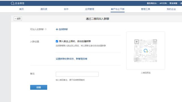 第二种方法适用于客户人数多的情况,比如办活动的群聊,我们从企业微信后台进入客户联系模块的配置页面,我们设置加入群聊功能,先选择加群的方式,之后我们勾选自动建新群的选项,完成所有设置,就可以批量建群。