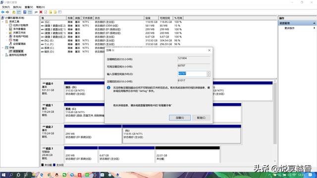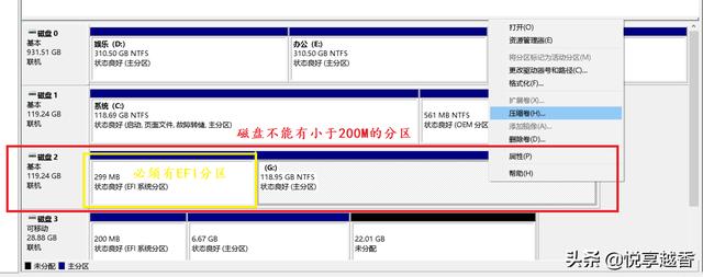 c.另外磁盘不能有小于200M的分区且必须用EFI分区(EFI分区也必须大于200M),满足这两个基本条件后,右键压缩卷。