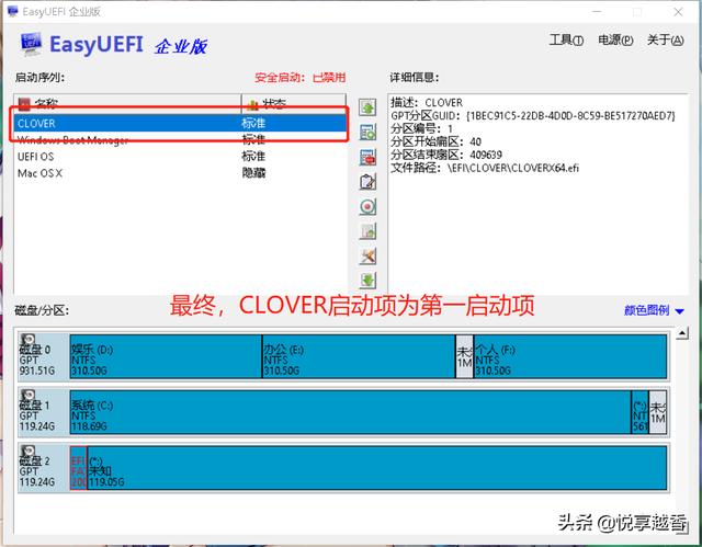 六、更改硬盘启动1.打开分区工具,把刚刚的EFI文件夹里的clover文件夹拷贝到硬盘的ESP分区(跟之前一样,用快捷键拷贝);