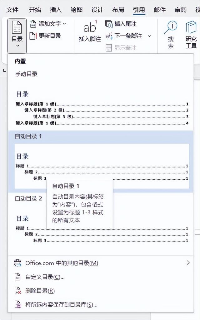 引用目录。依次单击Microsoft 365版word的引用-目录-自动目录,当然,如果希望自行设计目录样式,也可以选择“自定义目录”,进行具体的样式设计。