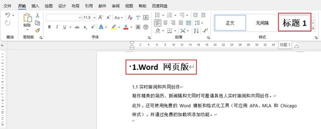 以Microsoft 365版word为例,可在开始菜单的样式功能中,为不同层级标题指定样式,一级标题指定“标题1”。