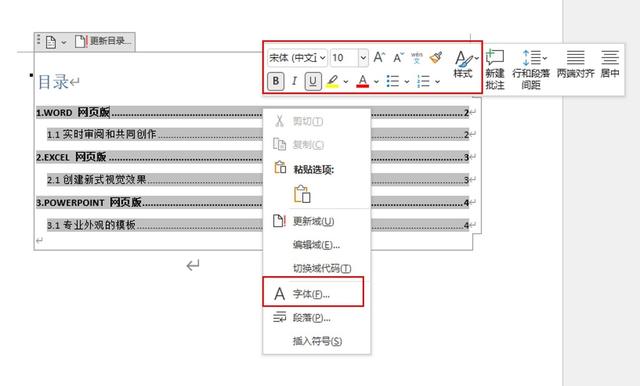 生成目录后,想需更改文字大小,如图7所示,可以右击选中文本后,在快捷悬浮窗中进行文字大小的更改,也可以使用右键菜单中的“字体”功能,进行更高级的文字属性设置。