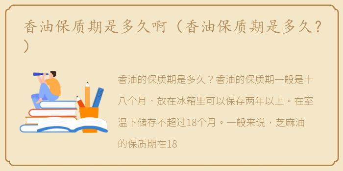 香油的保质期是多久?香油的保质期一般是十八个月,放在冰箱里可以保存两年以上。在室温下储存不超过18个月。