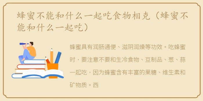 蜂蜜具有润肠通便、滋阴润燥等功效。吃蜂蜜时,要注意不要和生冷食物、豆制品、葱、蒜一起吃,因为蜂蜜含有丰富的果糖、维生素和矿物质。