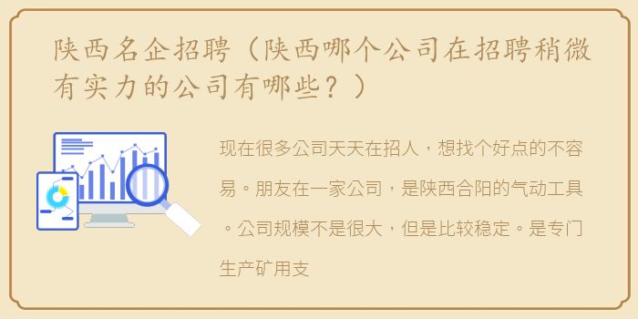 欢迎您来到125生活网,我是小二,许多人对这个问题还不是很清楚,以下是我对陕西名企招聘,陕西哪个公司在招聘稍微有实力的公司有哪些?精心的整理,预计阅读30秒。