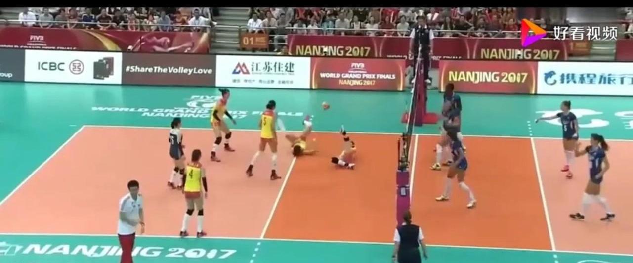 那个?2017世界女排大奖赛半决赛,中国女排对阵意大利女排。19-20第二场,意大利女排出场?球?追一个钱,钱输了?错了?飞到4号位,本来要在4号位和5号位之间进攻的朱婷冲上去救球,然后呢?用什么?什么时候?英镑?结束了吗?为了拯救?球?这是什么?尴尬?林恩。于?手?打它?一个?起来,刁?林恩。于?没事的,朱?婷?手腕受伤?那个?这时候,朱?婷?痛苦?太好了,退出游戏。