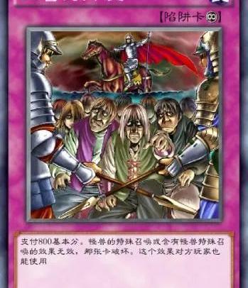 皇室压迫.皇宫永恒陷阱系列之一,怪物的特殊召唤,因为特殊召唤在OCG占有相当大的比重,一度成为玩家头疼的一张牌。在游戏MG的设定中,卡牌画面描绘了设置了通行税等皇宫重税的暴君在压力下被民众抵制并被派出镇压的场景。
