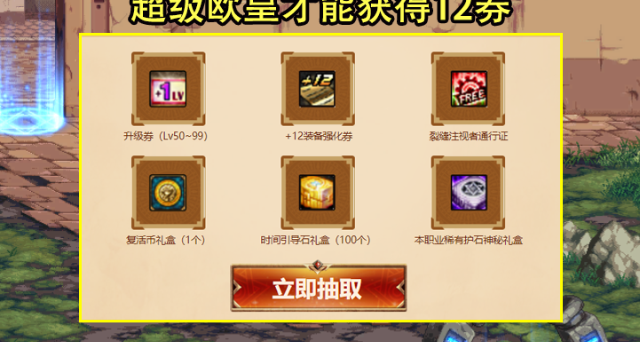 至于抽奖奖励,主要有六种可以抽取的道具。除了12增强券,其他道具都是蚊子腿奖励。至于12增强券,抽到的几率极低,只有0.001%,普通玩家就不要想了。只有超欧帝才能得到。