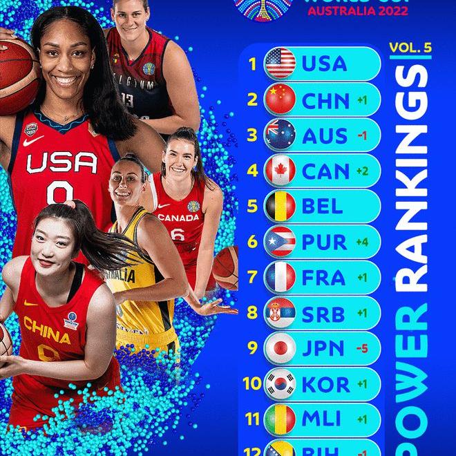 第五位也是最新的女性美国篮球世界杯排名分别是1、美国2、中国3、澳大利亚4、加拿大5、比利时6、波多黎各: