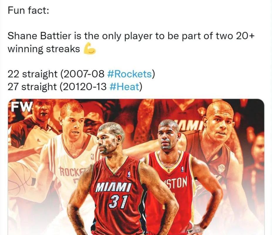 媒体FadeawayWorld曝光数据:一个有趣的事实,巴蒂尔是NBA历史上唯一两次20连胜的球员。第一次是2007-08赛季火箭的22连胜,第二次是2012-13赛季热火的27连胜。是的,让让我们今天来谈谈巴蒂尔。
