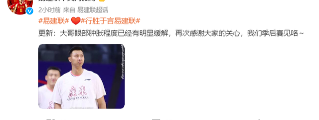 第三赛段最后一战,广东宏远对阵山东男美国篮球队,易建联在进攻中遭遇吉伦沃特犯规,眼睛肿胀非常严重,提前离场。赛后,许多球迷都在担心易建联的伤害。作为广东宏远的内线核心,一旦易建联因伤无缘季后赛,对阵天津男美国篮球队,广东宏远将非常被动。据国内媒体最新消息,易建联他的眼睛肿胀已经明显缓解,他参加了球队对抗训练,确认他可以打季后赛。