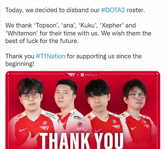 昨天,T1战队官方宣布解散DOTA2赛区现有阵容,包括OG双料冠军Ana和Topson的全部5名成员。 今年T1的团队DOTA2赛区整体战绩不佳。Ana和Topson在加入后略有提升,但在TI11的最后突围中依然被淘汰,无缘主赛。