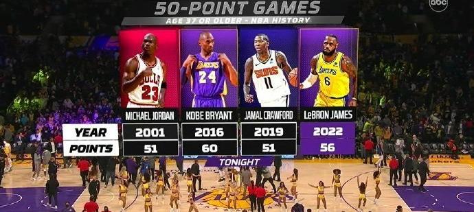 在NBA历史上,只有三名球员能在37岁之后单场得分达到50分,分别是乔丹、科比和克劳福德。詹姆斯成为第四个实现这一壮举的球员。詹姆斯单场拿下56分,仅次于科比退休时60分。此外,詹姆斯成为NBA历史上第一个21岁前和35岁后得分都达到50分的球员。