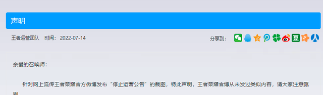 对此,《王者荣耀》官方今晚也特别发布公告:鉴于截图中的停止运营公告由王者荣耀官方微博发出,特此声明,王者荣耀官方博客从未发出过类似内容,请注意甄别。