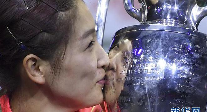 (2019世乒赛,刘夺冠后亲吻奖杯)