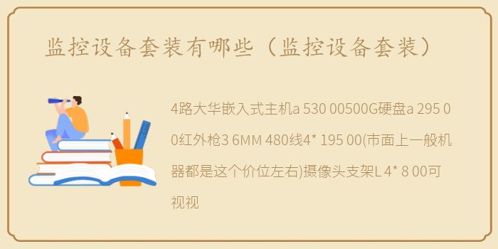 4路大华嵌入式主机a 530.00500G硬盘a 295.00红外枪3.6MM 480线4* 195.00(市面上一般机器都是这个价位左右)摄像头支架L 4* 8.00可视视线75-3 100m 75.00(应该够你用了)电视线2 * 0.75 100m 105.00(另售12V4A集中供电所有费用35.00(4个摄像头一个你可以用你的电视做显示器,切换AV文章。如果半球雨水不多,就要用红外线栓。