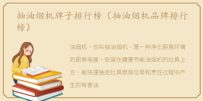油烟机,也叫抽油烟机,是一种净化厨房环境的厨房电器。安装在健康节能油烟机的灶具上方,能快速抽走灶具燃烧垃圾和烹饪过程中产生的有害油烟,排出室外,减少污染,净化空气,具有防毒防爆的安全保障功能。